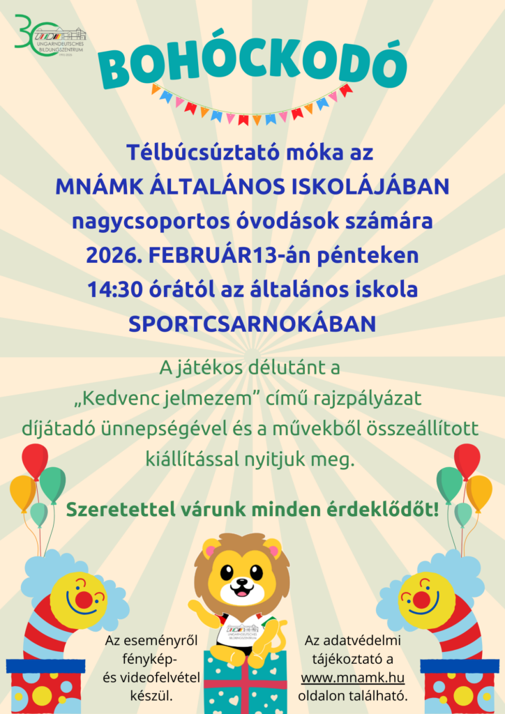 Szeretettel várjuk a leendő első osztályos gyerekeket és szüleiket egy vidám, játékos, farsangi hangulatú délutánra. A program során megtekinthetők a rajzversenyre érkezett alkotások, és sor kerül az ajándékok átadására is. A további információk a plakáton találhatók. Szeretettel várunk minden érdeklődőt! MNÁMK Általános Iskola Tantestülete