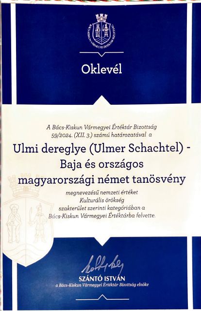 Az időközben országos német betelepülési emlékmű rangjára emelt hajó nagy érdeklődésnek örvend; minden évben számos látogatócsoportot fogadunk. Nagy örömünkre szolgál és büszkeséggel tölt el bennünket, hogy az ulmi dereglye és a hozzá kapcsolódó országos német nemzetiségi tanösvény bekerült a Bács-Kiskun Vármegyei Értéktárba. Az erről szóló hivatalos oklevél ünnepélyes átadására november 17-én, hétfőn került sor a bajai városházán.