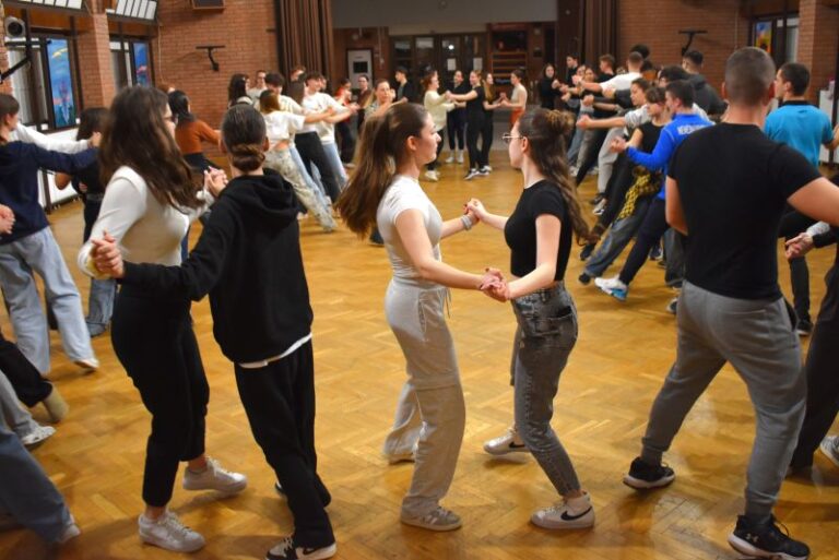 Im zweiten Teil des Abends führte Adrienn Sevaracz kroatische und serbische Kreistänze vor, unter anderem auch „macedon”, „kóló“ und „hoppá cuppá“. Adrienn Sevaracz hat nicht nur die Schritte gezeigt, sondern auch einige interessante Fakten verraten, z. B. dass man „kóló“ in die andere Richtung ziehen muss, wenn man sich auf der anderen Seite der Donau befindet.