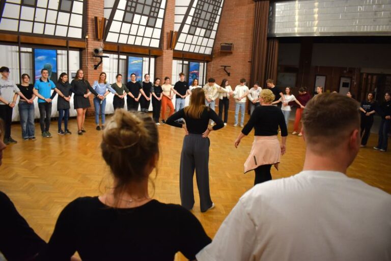 In der ersten Hälfte des Programms lernten die Teilnehmer ungarndeutsche Tanzschritte kennen. Zsanett Melcher zeigte die Grundlagen von Walzer, Polka und Marsch, während József Emmert auf dem Akkordeon spielte.