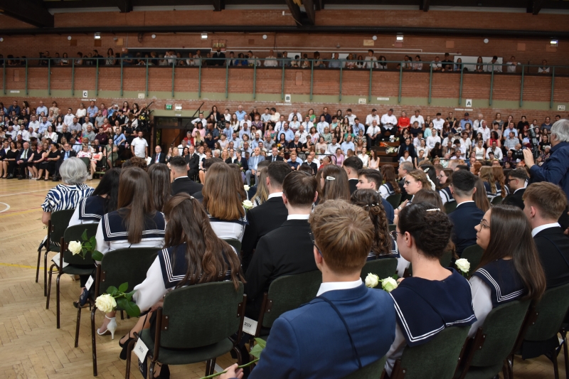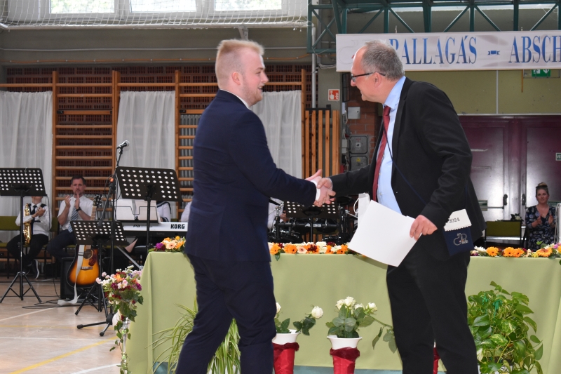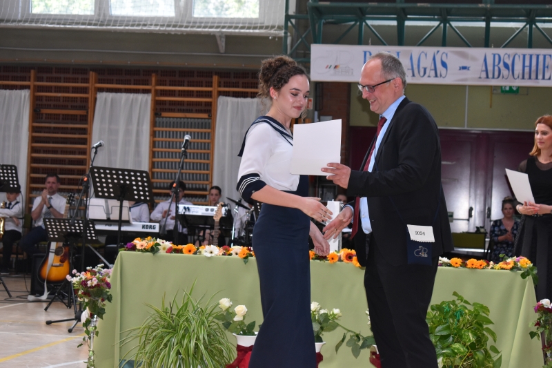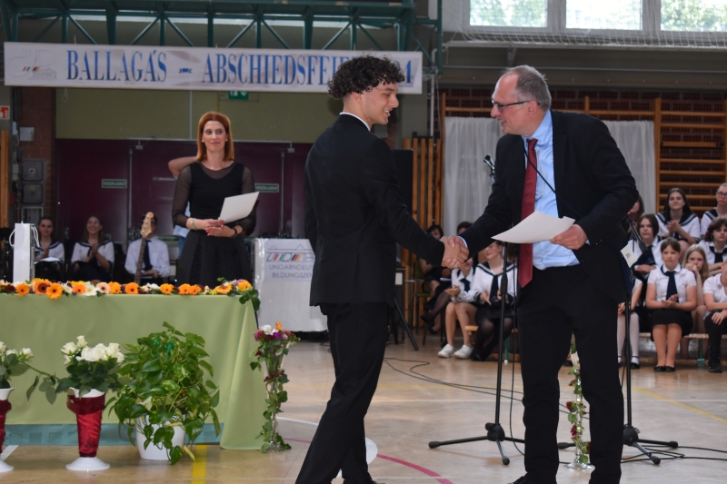 Peter Stübler intézményvezető ünnepi beszédében felelevenítette azt az időszakot, amikor ő állt érettségi előtt. „Az elmúlt napokban megpróbáltam visszaemlékezni arra, hogy én mire gondoltam 34 éve. Álmok és remények kavalkádjával akkor tudatosult bennem először, hogy életem egy szakasza a végéhez közeledik. Már nem számítok gyereknek vagy tinédzsernek, és a saját kezembe kell vennem az életemet. Tele volt a fejem tervekkel. Úgy gondolom, ez a ti esetetekben is így van. Merjetek belevágni új dolgokba, próbáljátok meg az álmaitokat valóra váltani, és ne feledjétek, ha valami elsőre nem sikerül, mindig van egy második esély.”
