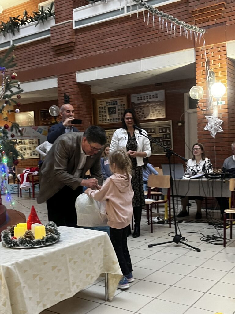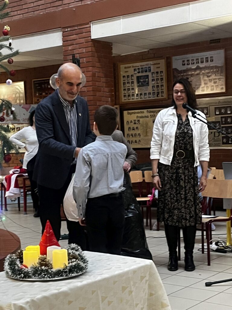 Az ajándékok ünnepélyes átadására 2025. december 15-én, hétfőn reggel került sor az iskolában, a 3. adventi gyertya meggyújtását kísérő ünnepség keretében. A klub képviseletében Sarlós István, a szervezet titkára és leendő elnöke, valamint Sipos János klubtag, a jótékonysági futások szervezője adták át az ajándékokat.