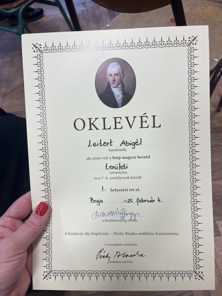 2026. január 13-án került sor a Kazinczyról elnevezett Szép magyar beszéd verseny iskolai fordulójára. Leitert Abigél 7. a osztályos tanuló (felkészítő tanár: Páncsity Orsolya) vívta ki magának az 1. helyet és ezzel a lehetőséget, hogy iskolánkat képviselheti a területi fordulóban.