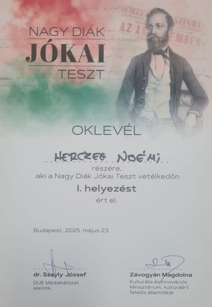 Herczeg Noémi, az MNÁMK 12.d osztályos tanulója nyerte a Nagy Diák Jókai Teszt elnevezésű vetélkedőt. A részletekről kérdeztem a boldog győztest.