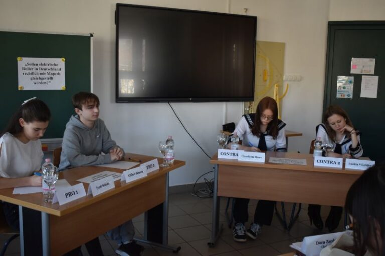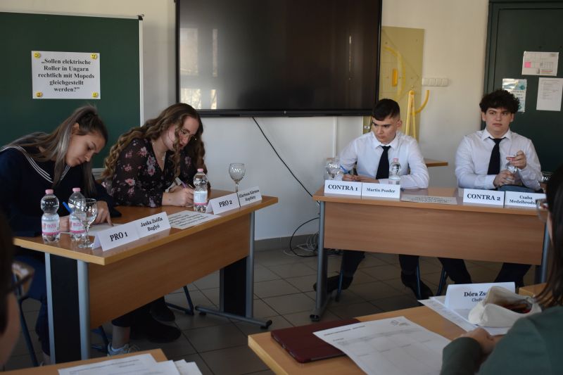 Az idei vita témája a következő volt: „Szükséges-e jogilag egyenértékűvé tenni az elektromos rollereket a segédmotoros kerékpárokkal Magyarországon/Németországban?” A résztvevők erős érvekkel, kreatív megközelítésekkel és korrekt vitakultúrával győzték meg a zsűrit és a közönséget.