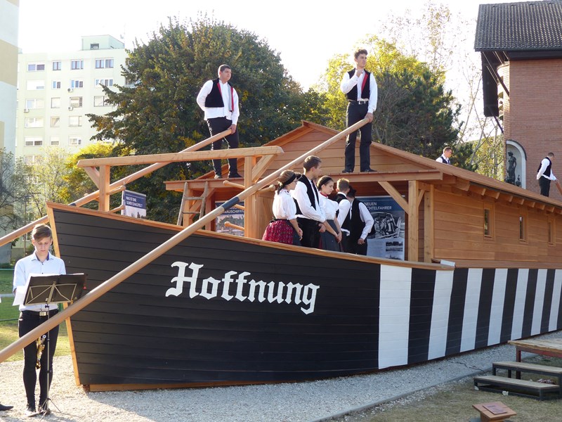 Az ünnepi műsorban az MNÁMK énekkarának német dalai után, egy ‘időutazás’ következett. A diákok, sváb népviseletbe öltözött felnőttekkel együtt ‘érkeztek meg’ az ulmi dereglyével Bajára.